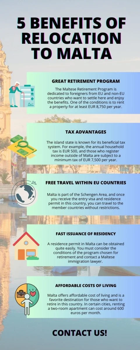 | Reasons to retire to Malta | – great living conditions, – culture, – great health system, – dedicated programs to gain citizenship |